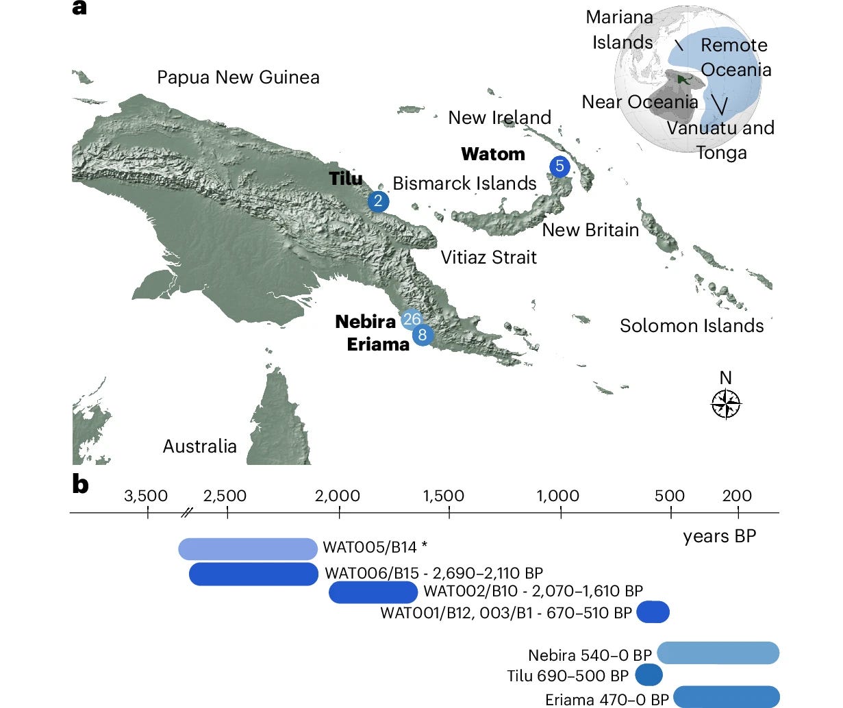 The story deepens on the south coast of mainland New Guinea, where the sites of Nebira and Eriama lie just a few kilometers apart. Yet the genomes of individuals from these sites tell strikingly different stories.