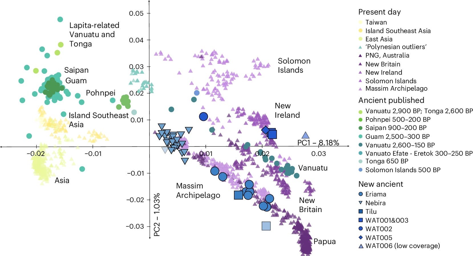 The researchers also addressed a separate but related question: how were the Mariana Islands first settled? Genomic comparisons suggest that these remote Pacific islands were most likely colonized from island Southeast Asia rather than from Near Oceania. One key line of evidence comes from a single individual on Watom Island whose genome split earlier than Lapita-associated genomes, matching ancient genomes from Guam and Saipan more closely.