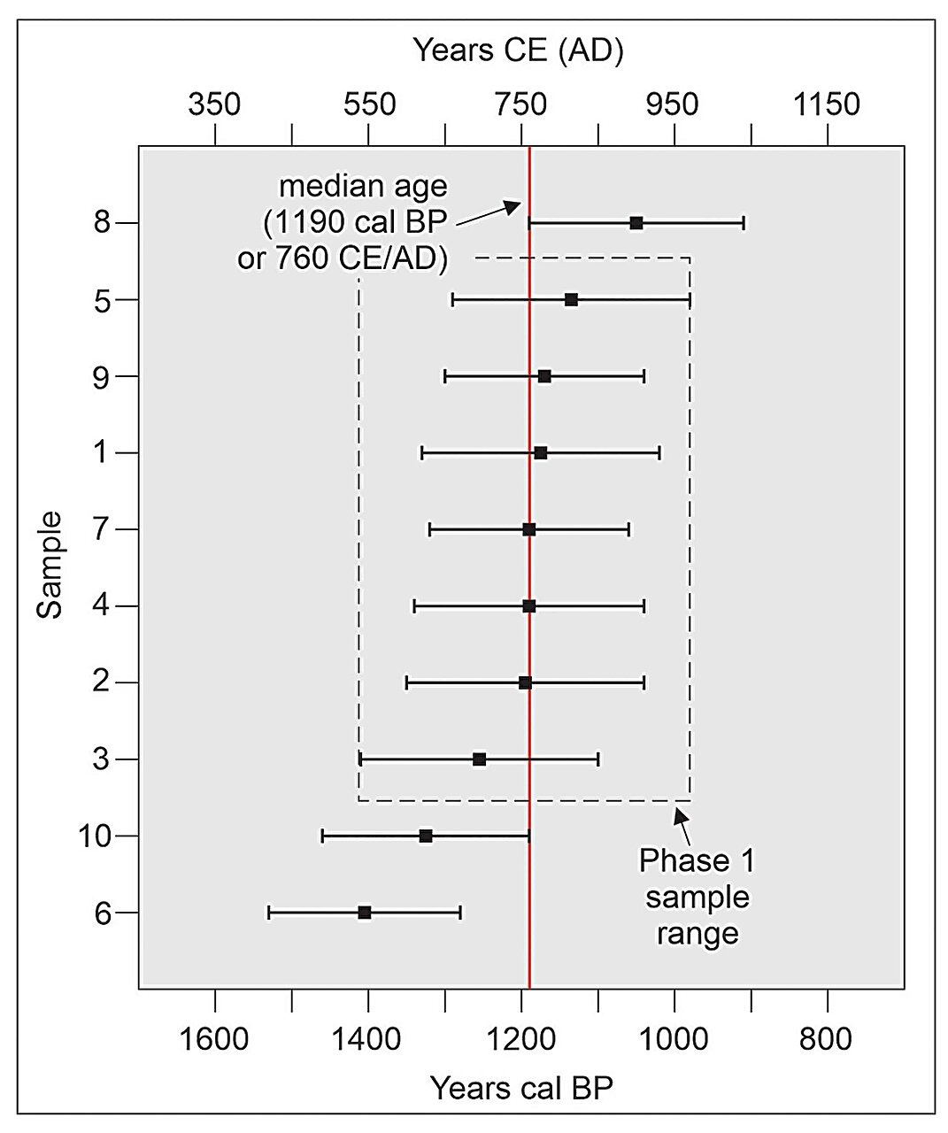The radiocarbon dates came back clustered. Tightly. The median age across all ten samples was 1,190 calibrated years before present, or roughly 760 CE. The full range runs from about 420 to 1040 CE, a span of six centuries. The clustering was unexpected enough that the team ran a second phase of dating specifically to check it.