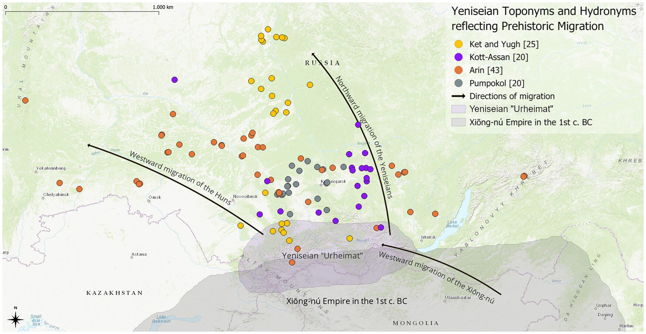 Place names across Inner Asia and into Eastern Europe suggest a westward trail of Arin-speaking populations—matching the trajectory of the Huns from the Altai-Sayan region to the Carpathian Basin.