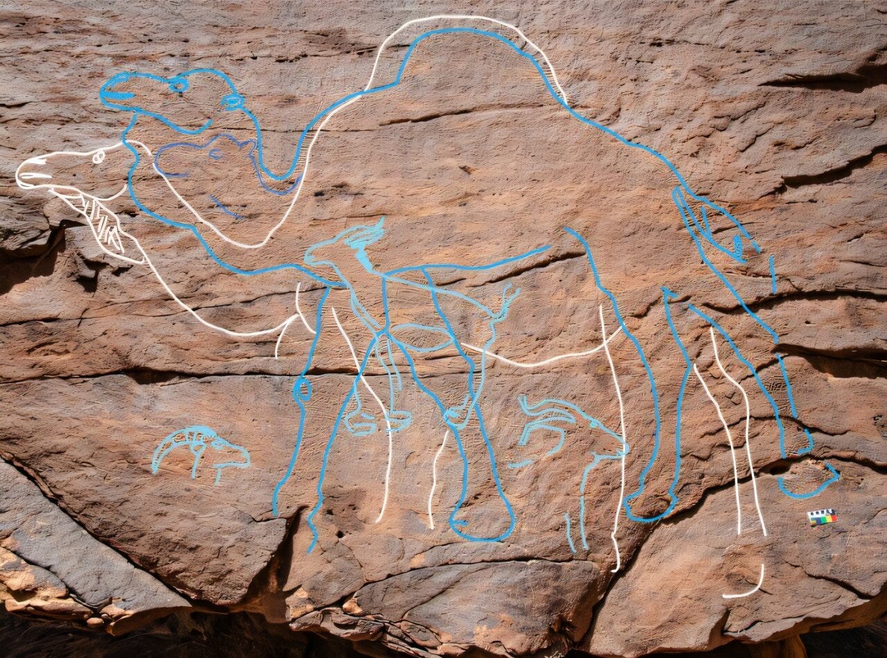 On the sandstone cliffs of northern Saudi Arabia, enormous camels stand frozen in stone1. Some measure over three meters long, carved with precision into the rock face. They are joined by ibex, gazelles, equids, and aurochs—animals once crucial to human survival in the desert interior.