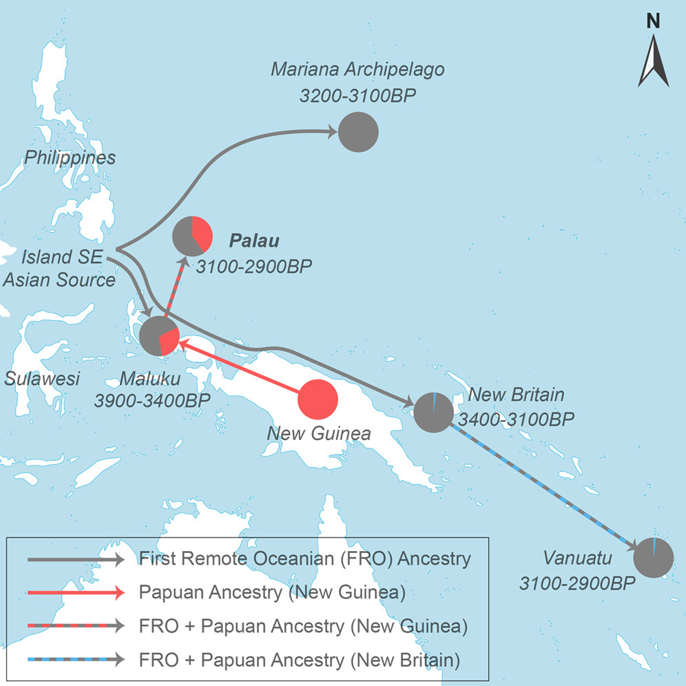 In Vanuatu and Fiji, the sequence runs differently. Early settlers there were essentially pure Southeast Asian. Papuan ancestry filtered in centuries later, carried by different groups moving through island Melanesia. Palau doesn’t follow that trajectory at all. The mixing had already happened, before the boats left.
