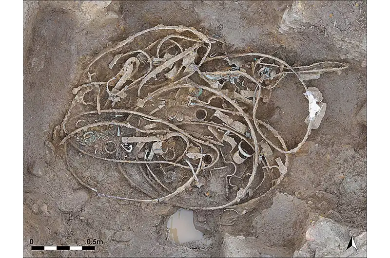 The manner of deposition is as striking as the objects themselves. The vehicles had been dismantled. Many items had been deliberately bent, broken, or exposed to intense heat before burial. Partially melted copper-alloy objects, glass droplets, and melted silver were distributed throughout Hoard 1. The iron tyres had probably been heated to enable bending, a process that left haematite traces on their surfaces. But none of this burning happened in the pit: the surrounding sediment showed no discolouration, no charcoal concentration. The material had been processed elsewhere, then brought here.