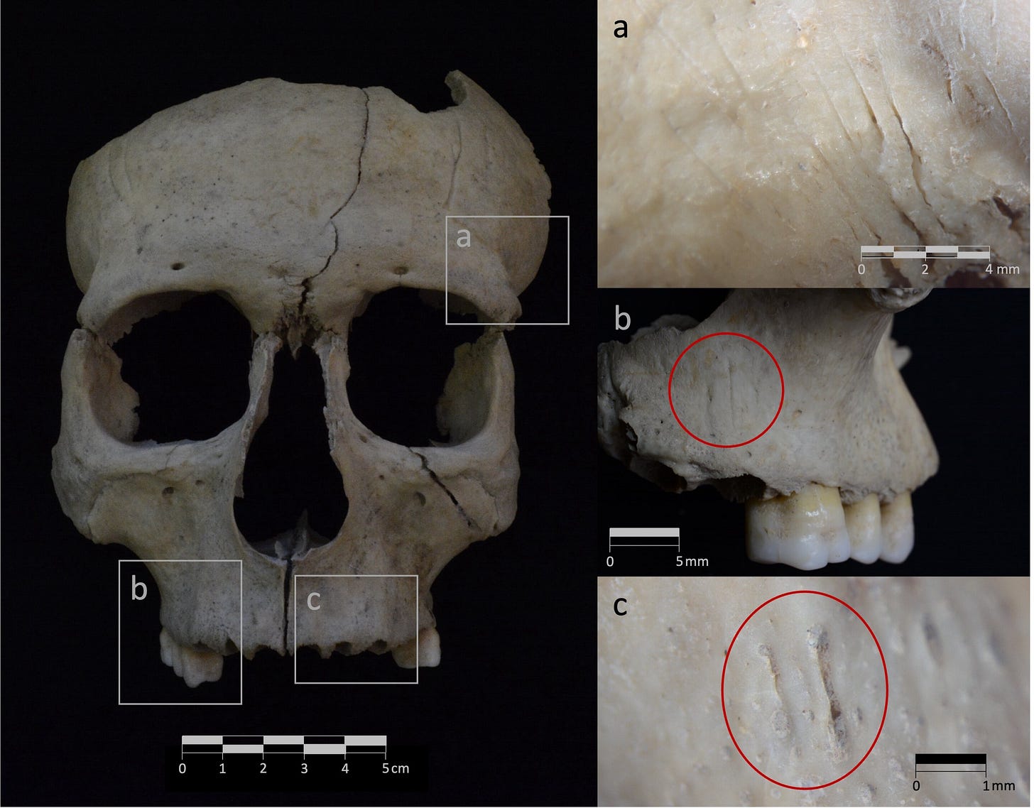 The young man died violently. Someone struck him from behind with a sharp, heavy weapon, the blade cutting deep into the left side of his frontal bone. The angle was nearly perpendicular. Then came more blows to the right side, these at a sharper angle, the cuts overlapping as if the attacker was adjusting their aim. After he fell, someone took a thin instrument and carefully scraped the flesh from his skull, working the blade across the forehead, around the eye sockets, and down over the cheekbones and jaw.