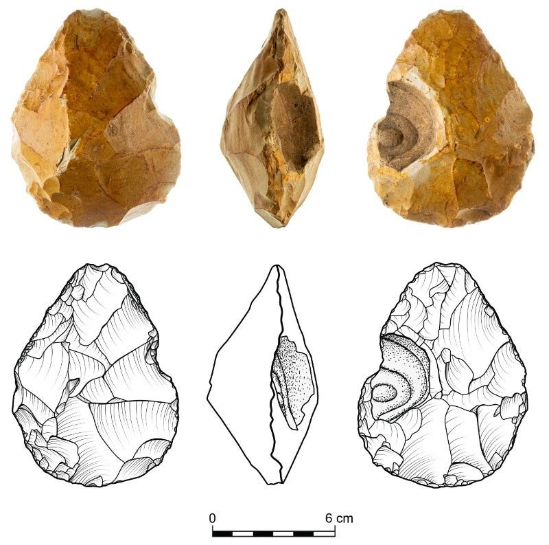 Muataz Shalata lives in the town of Sakhnin, in the Lower Galilee hills of northern Israel. He knows the landscape well. While exploring the valley that shares his town’s name, he began noticing flint tools scattered across olive groves and open ground, and eventually came across handaxes — the teardrop-shaped bifaces that are the most recognizable artifact of the Lower Palaeolithic. He contacted Ran Barkai at Tel Aviv University, and over the course of 2024 and 2025, a systematic survey of the area revealed something worth paying attention to: a concentration of Acheulean handaxes, more than 200 recovered so far, spread across a landscape unusually rich in high-quality flint, geodes, and fossil-bearing nodules.