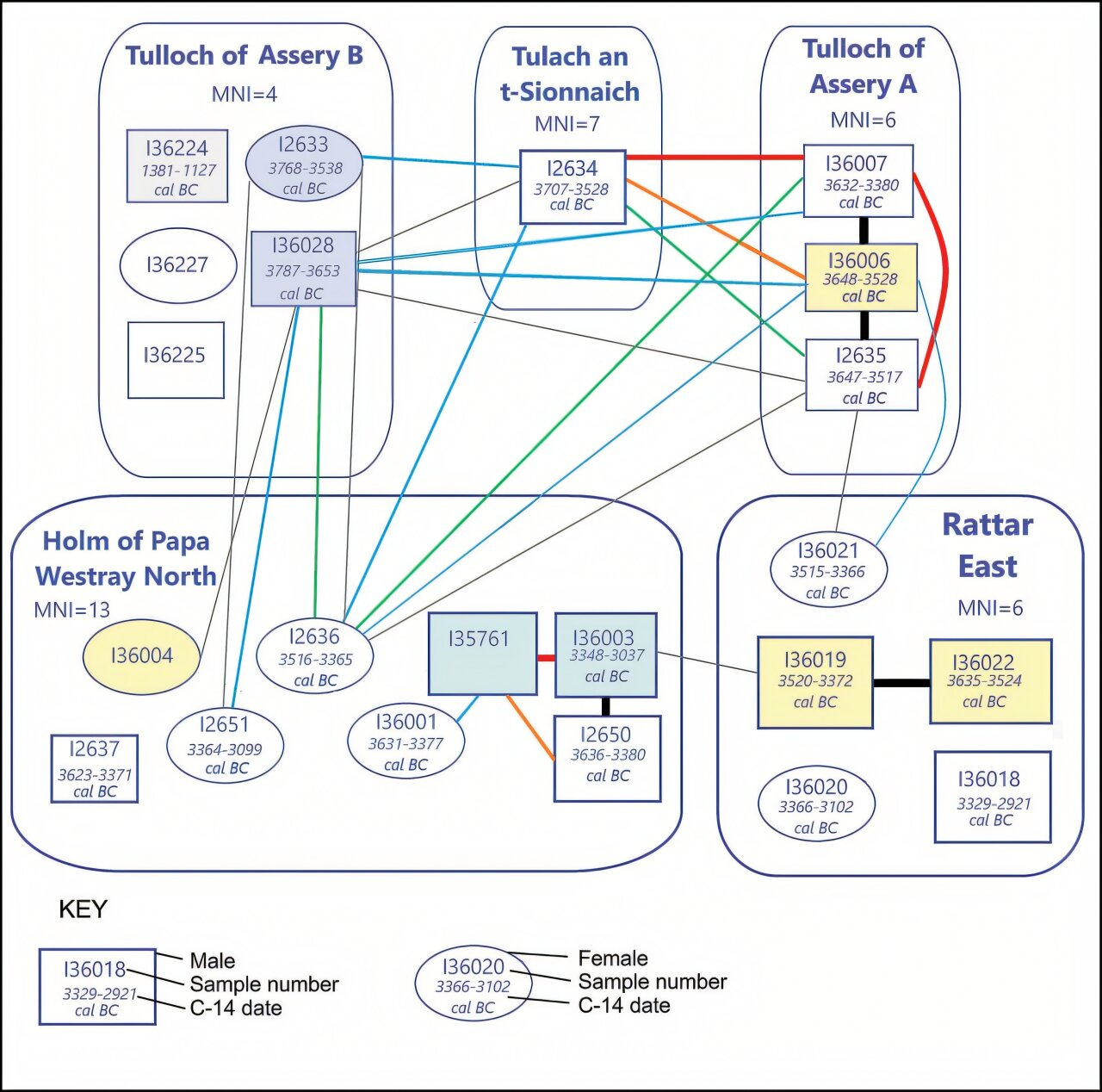The specific relationships matter. At Tulloch of Assery A: the father-son-grandson sequence just described. At Rattar East: two brothers. At Holm of Papa Westray North: a father and son, plus a man who was the father’s maternal uncle or half-brother. And connecting the two areas of Loch Calder: the male buried at Tulach an t-Sionnaich was likely the paternal uncle, half-brother, or grandfather of one of the males at Tulloch of Assery A. The man at Tulach an t-Sionnaich and the senior male at Tulloch of Assery A may have been close enough kin that their communities recognized a shared patriline, even as they built separate monuments.