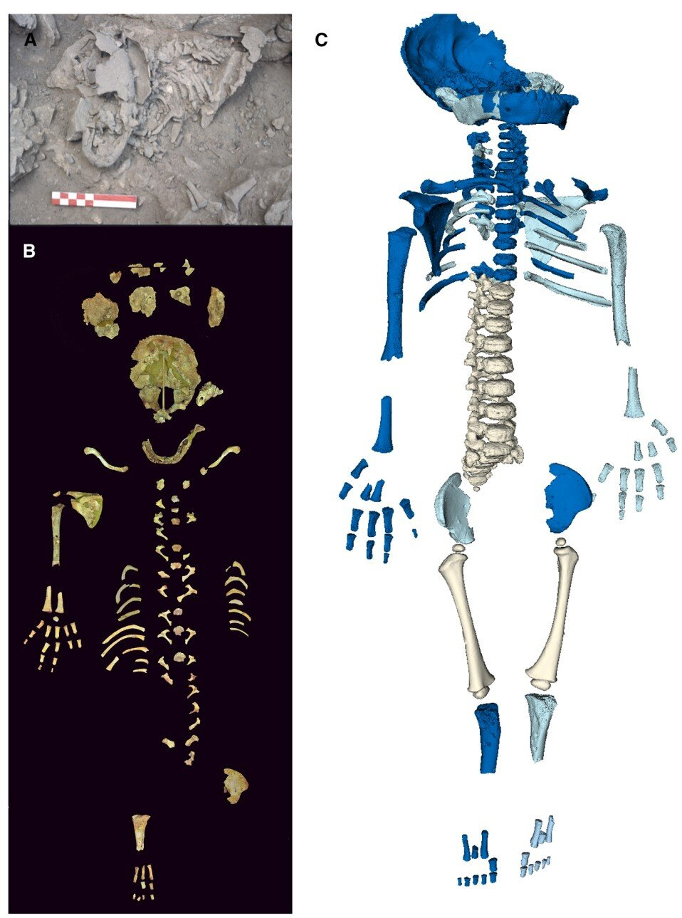The infant died sometime in the first year of life. The teeth say so. Enamel growth lines, those microscopic records laid down daily like tree rings, put the age at roughly six months. But the bones tell a different story. The humerus, the femur, the overall postcranial development: by modern human standards, they belong to a child about twice that age. Fourteen months, not six.
