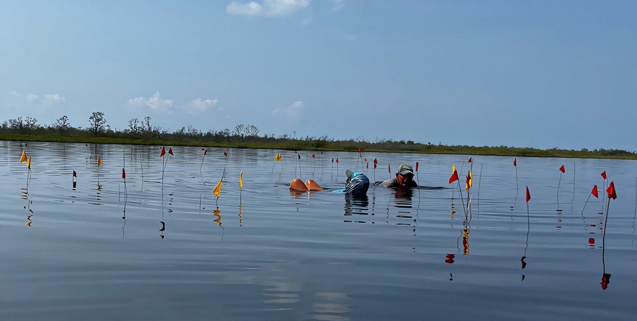 The discovery, reported1 by Dr. Heather McKillop and Dr. E. Cory Sills, describes Ch’ok Ayin, a Late Classic (AD 550–800) household frozen in mangrove peat several meters below the sea floor. The site’s preservation is extraordinary: 56 hardwood posts still stand in their original positions, arranged in four buildings whose outlines mirror living Maya house groups today.