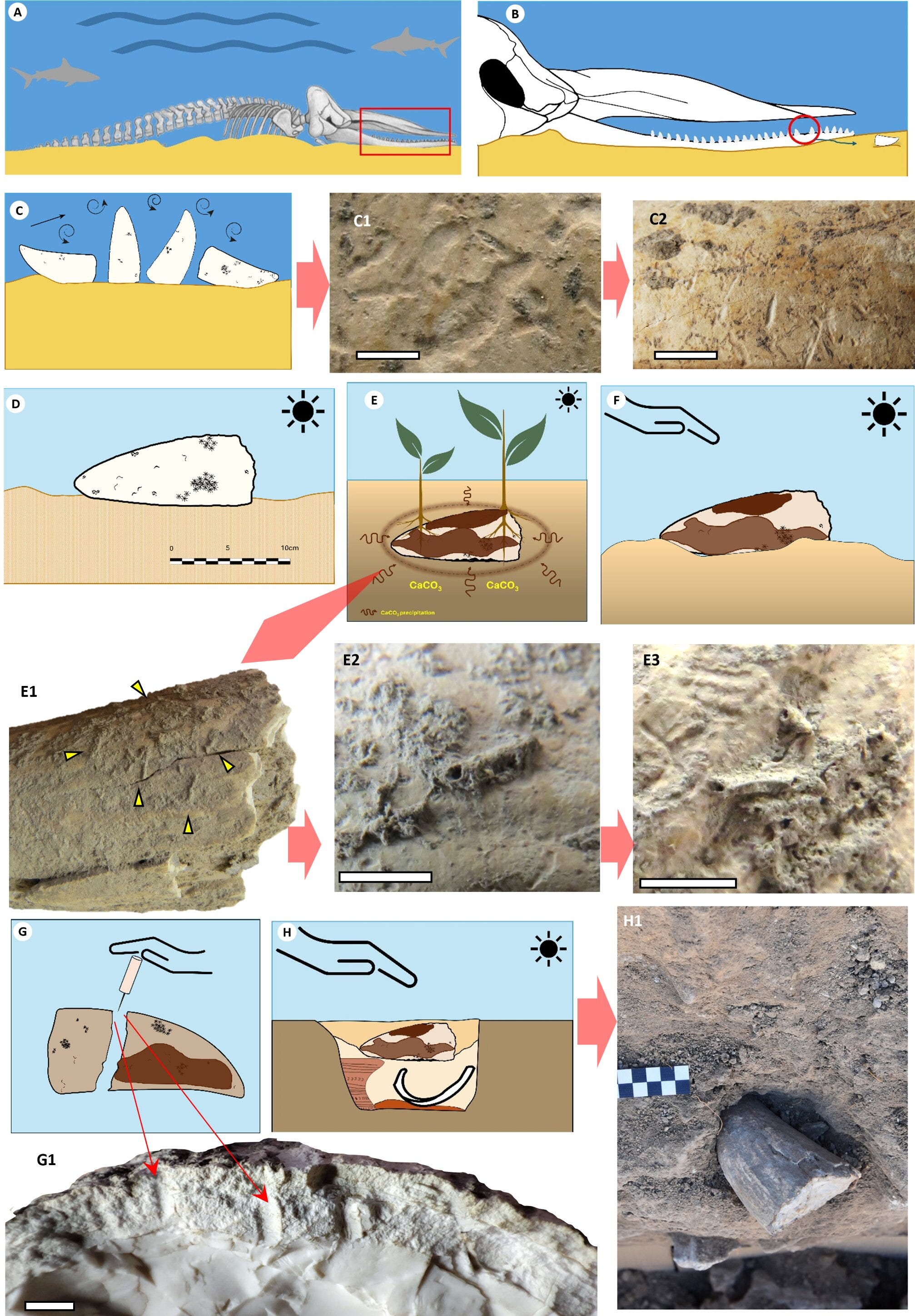 Microscopic analyses revealed a suite of marine bioerosion traces—borings from sponges, annelid worms, and barnacles—as well as shark bite marks. These clues suggest that the whale died at sea, its carcass sank, and the tooth remained submerged long enough to accrue biological scars. Only later did it resurface, likely after a storm event, and get picked up by humans.