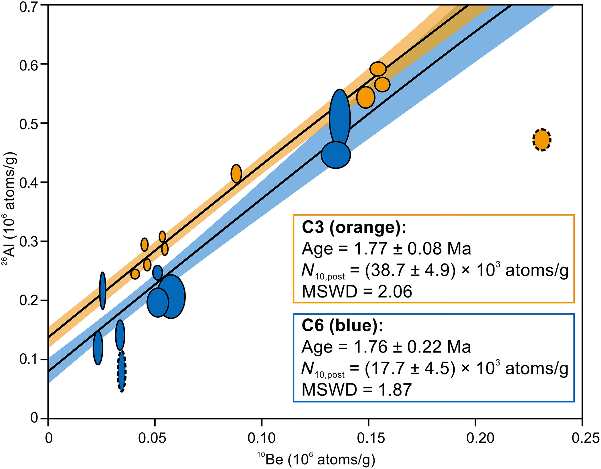 The standard “simple burial” version of this technique has existed for decades, but it carries a significant limitation: it assumes the sediment was buried quickly and deeply enough to stop all postburial isotope production, and that the burial event happened only once. Those assumptions fail fairly often. The isochron approach, which the Yunxian team used, is more sophisticated. Instead of relying on a single sample, it uses multiple clasts from the same depth and plots their ²⁶Al and ¹⁰Be concentrations together. Samples with different pre-burial exposure histories will lie along a consistent line if they share the same burial age. Outliers, sediments reworked from older deposits or samples with complicated burial histories, fall off that line and can be identified and excluded. One sample from the fossil-bearing layer did exactly that and was removed from the calculation.