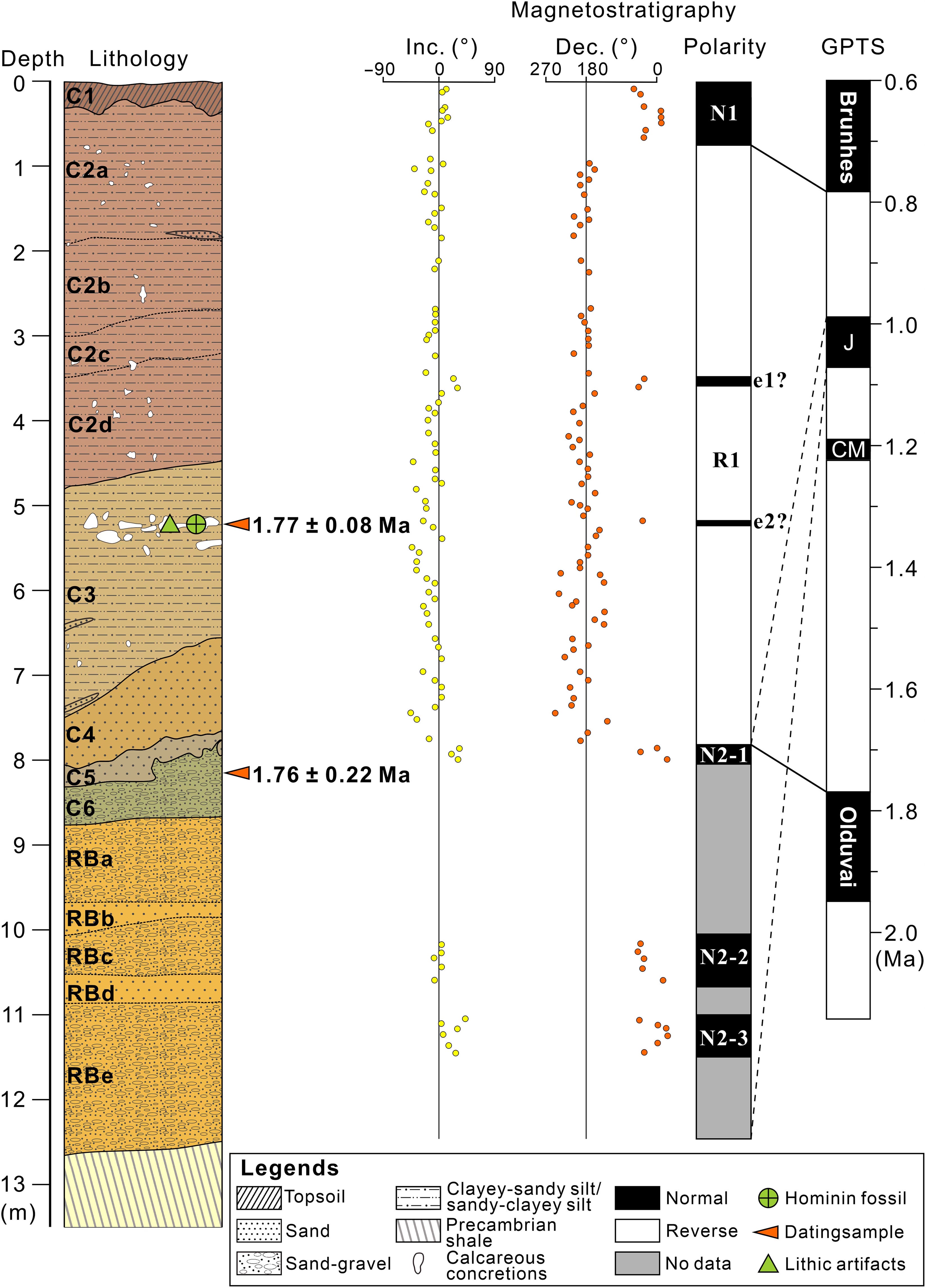 There is also an independent geomorphological check. Previous studies had assigned a normal polarity zone in the lower sediments to the Jaramillo subchron (roughly 990,000 to 1,070,000 years ago). The new dates imply that zone actually corresponds to the Olduvai subchron, which ran from about 1.78 to 1.95 million years ago. That’s not a small reassignment, and it requires recalibrating the entire paleomagnetic interpretation of the site. The team argues this is actually the more parsimonious reading, consistent with the burial ages and with the broader geomorphological framework of the Han River terrace sequence.