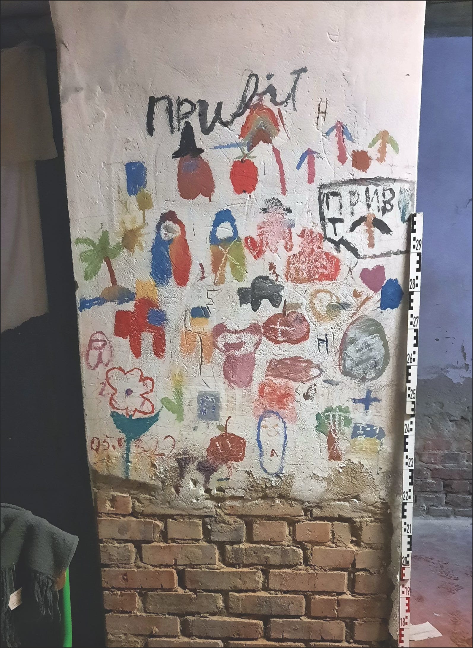 Above one cluster of drawings, the word “Hello” is written in Ukrainian. Above another, “No Exit.” Elsewhere, a child wrote: “Mommy, when will you buy me a phone?” Words from the Ukrainian national anthem appear, and other inscriptions now partly faded or illegible.