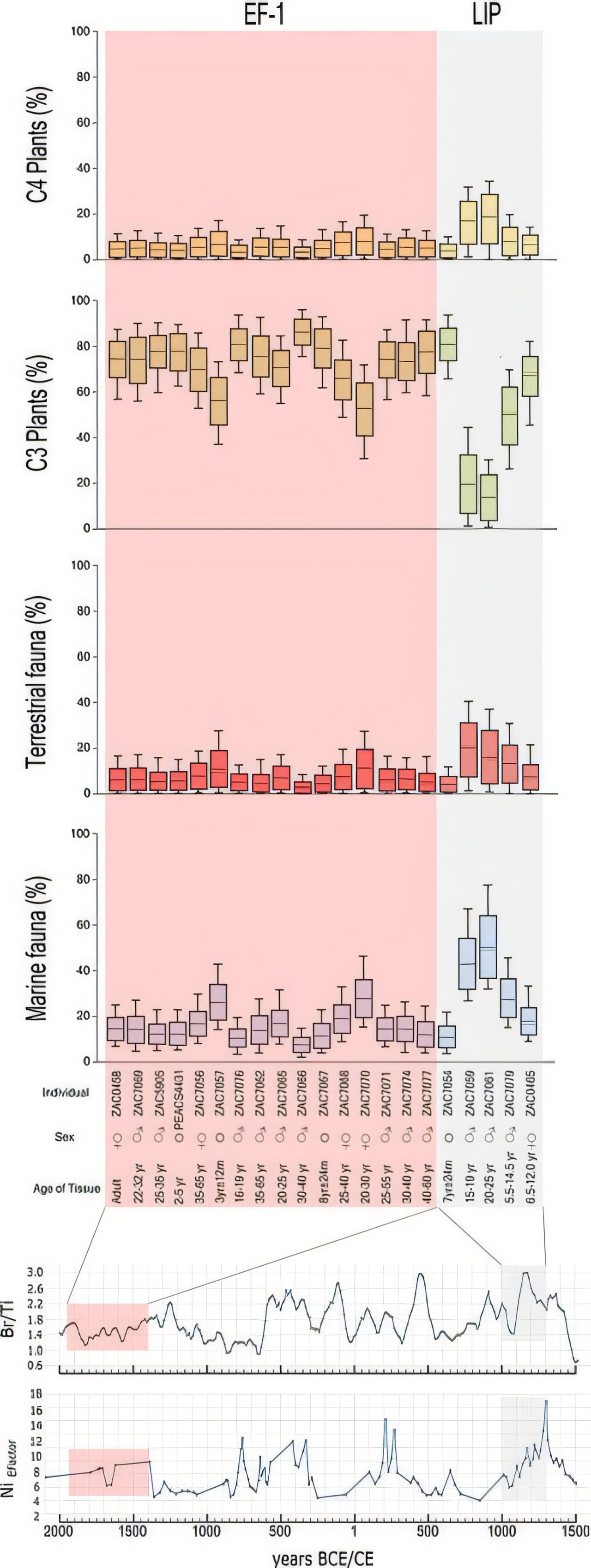 Three millennia later, isotope evidence from the Late Intermediate Period shows marine foods playing a larger role, coinciding with cooler sea surface temperatures that boosted coastal productivity. Yet farming—especially of C3 plants—remained dominant.