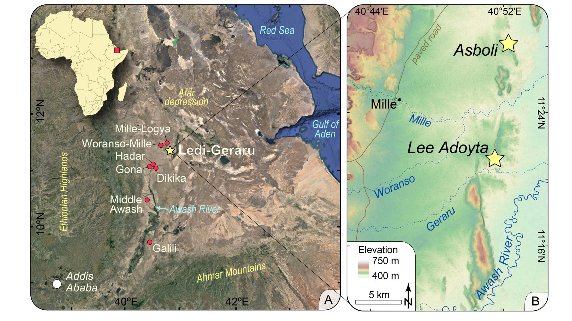 Villmoare, B., Delezene, L. K., Rector, A. L., DiMaggio, E. N., Campisano, C. J., Feary, D. A., Ali, B. M., Chupik, D., Deino, A. L., Garello, D. I., Hayidara, M. A., Locke, E. M., Omar, O. A., Robinson, J. R., Scott, E., Smail, I. E., Geleta Terefe, K., Werdelin, L., Kimbel, W. H., … Reed, K. E. (2025). New discoveries of Australopithecus and Homo from Ledi-geraru, Ethiopia. Nature, 1–7. https://doi.org/10.1038/s41586-025-09390-4